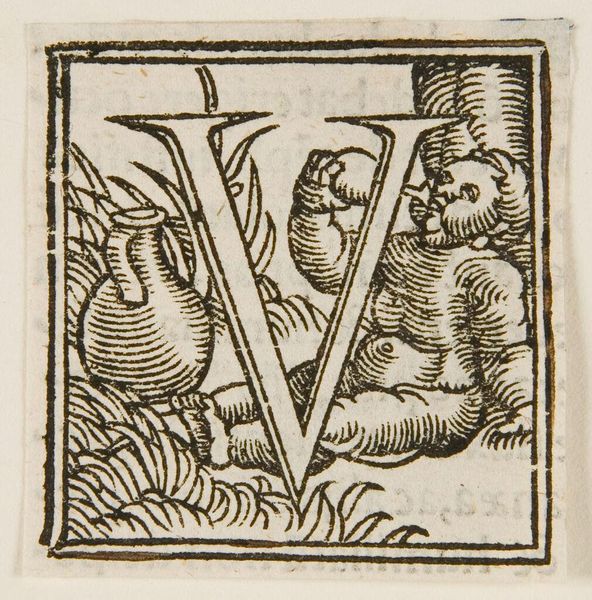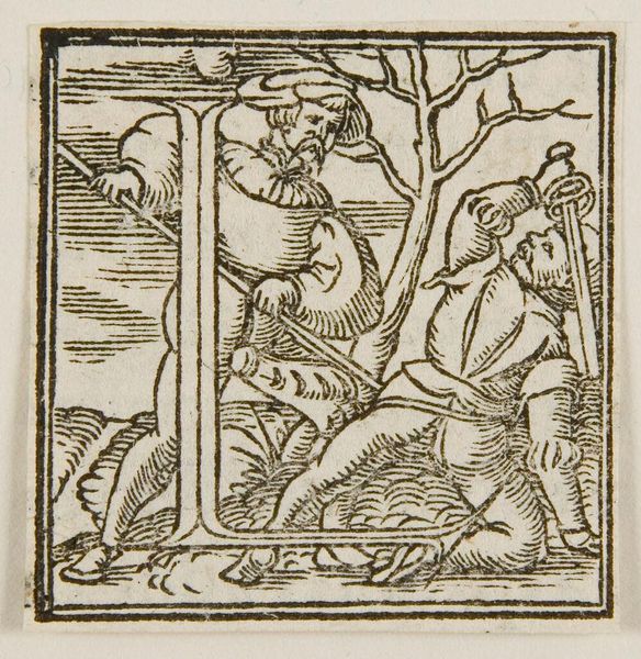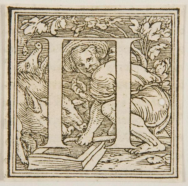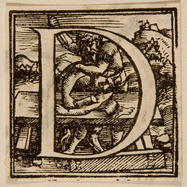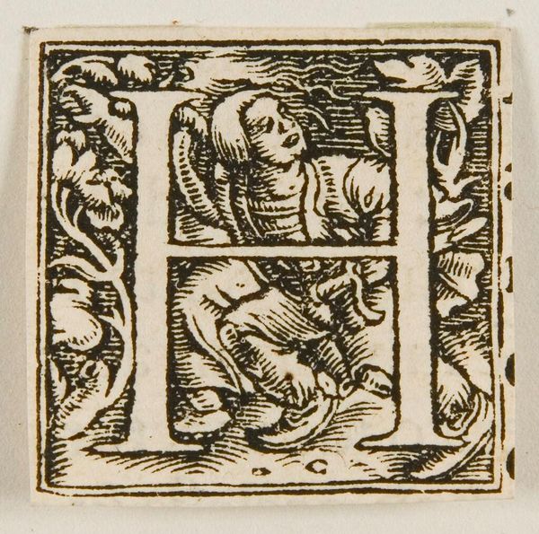 Editor: Here we have Hans Holbein the Younger’s "Letter E" from way back when. The detail is amazing, even if it's small. What’s your read on the stories hidden in this initial? Curator: It's like a tiny stage, isn't it? Holbein crams so much life, so much daily hustle, into that letter. I see little dramas unfolding – maybe a merchant haggling, someone sneaking a kiss. The "E" itself becomes a world. Do you feel that too? Editor: I do! It feels so alive for something so…functional, almost? Curator: Exactly! It’s function elevated to art. It reminds me that even the most mundane things can hold beauty, if you just look close enough. Makes you wonder what letter we'd choose to represent our lives today, doesn't it? Editor: Definitely something to think about, now that you mention it.