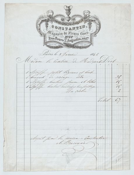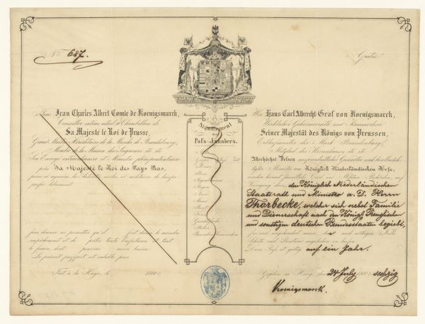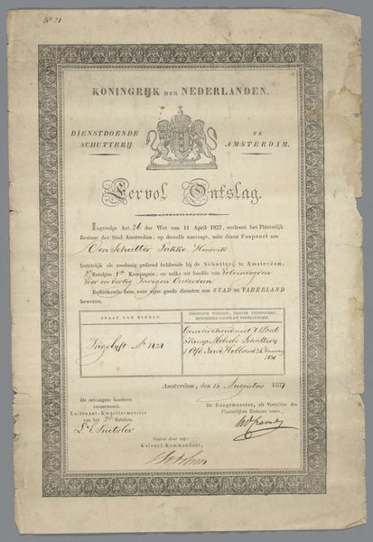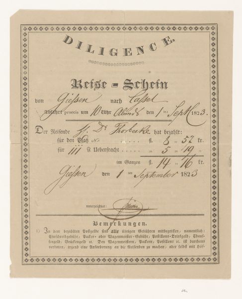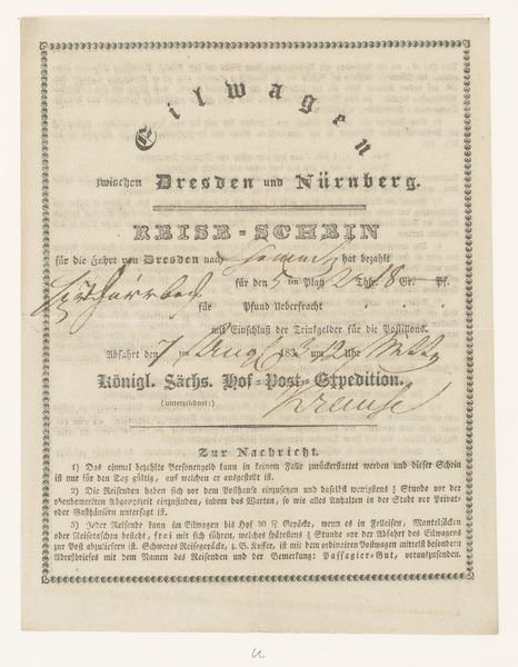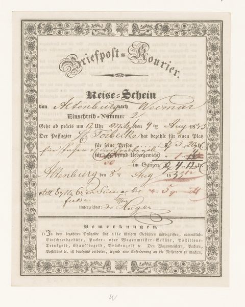 Curator: This work, simply titled "Reisdocument," originates possibly from 1833 to 1839, and it’s held in the collection of the Rijksmuseum. What’s your immediate impression? Editor: My eyes are immediately drawn to the graphic layout, the structured text blocks surrounded by decorative borders and flourishing handwriting annotating this historical document, evoking a strong sense of faded formality. It looks almost like an official proclamation, but clearly personal at the same time. Curator: Indeed. "Reisdocument" translates to "Travel Document", so this would have served as a ticket or a receipt. What's intriguing is that its anonymous creation and survival offer insights into 19th-century postal services between Cassel and Berlin. Imagine the socio-political implications behind its paper trail and travel regulations. Editor: From a formalist perspective, notice how the typography and border design contrast with the handwritten notations scribbled along the edges and squeezed into the form itself. This highlights the tension between the official and the individual. Look at how those handwritten annotations push past the confines of the ticket to show not only wear and tear but the very active nature of this document as part of the historical record. Curator: Absolutely! Each stamp, initial, and marginal note tells a story – marking stages in its physical movement and interactions with the authorities. We can infer volumes about how state and individual interests intersect from details like "Schnellpost-Cours"—referencing the fast postal service. It is suggestive of a society emphasizing communication. Editor: And how interesting is it to consider the relationship between information and decoration. The typographic components present clearly defined text. Whereas, we get this visual disruption presented through handwriting. Considering this visual and informational friction suggests something of a social friction at work. Curator: It's a powerful example of ephemera that opens multiple historical and visual dialogues, even across time. Editor: Precisely, I'm left contemplating how such an ordinary, utilitarian artifact embodies so much social and formal complexity.