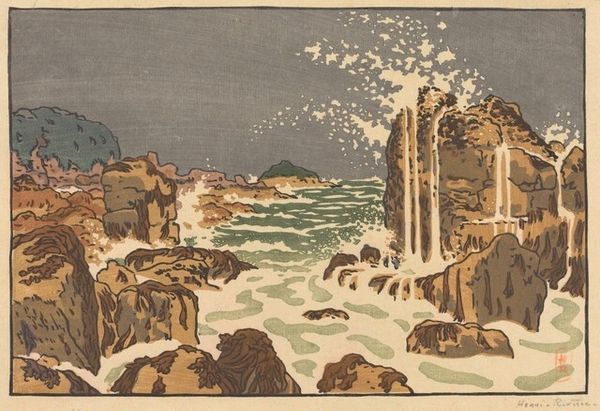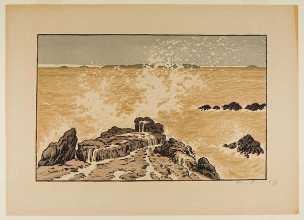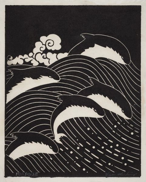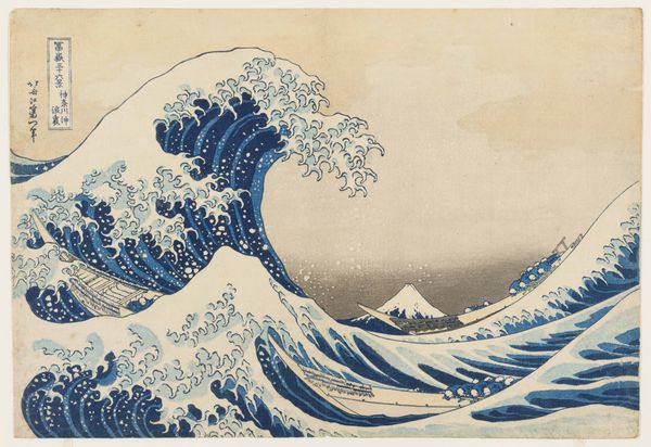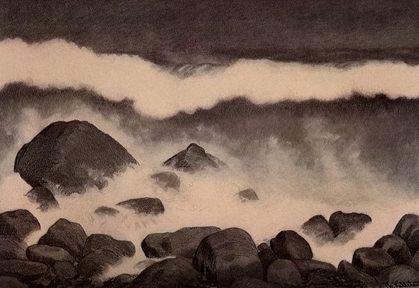 This wave scene, “Branding” by O. Droegl, looks like it was made with some kind of printmaking technique. The colour palette is limited, maybe three or four shades of grey, and white for the wave crests. It makes you wonder what the artist was thinking about during the process. The physical quality of the piece is interesting. The texture seems smooth, which is due to the printing process, but the subject is the roiling sea. Look closely and you can see how the wave foam has been handled with negative space, the paper left unprinted to depict movement and energy. The heavy sky, the dark waves, and the pale water together create a melancholy feeling. If you look at Hiroshige’s woodblock prints, you can see how artists across time use waves to speak to the human condition. Ultimately, art is like a conversation, a way of thinking about the world through images.