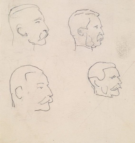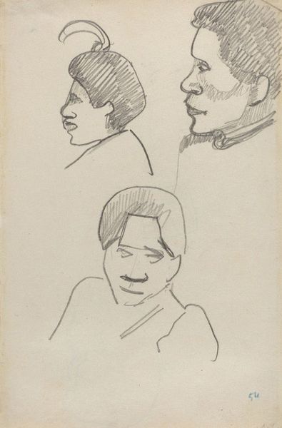 Reijer Stolk created this sketch, 'Heads of three African men,' in graphite on paper. Notice the ethereal quality conveyed through delicate lines that define the contours of the faces. Stolk's formal approach seems less about capturing precise likenesses and more about exploring the underlying structure and form. The lines serve as a framework, almost like a skeletal structure upon which the identity of the subjects is built. The composition invites us to consider how Stolk uses the arrangement of these heads on the page, with each positioned to offer a different perspective. This arrangement destabilizes conventional portraiture, where a single, definitive view is typically presented. Instead, Stolk offers a multiplicity of perspectives, challenging the viewer to piece together a complete picture. The sketch becomes a study in form, perception, and representation. The varying viewpoints and fragmentary nature of the drawing underscore the complex interplay between the artist, the subject, and the viewer, leaving room for ongoing interpretation.