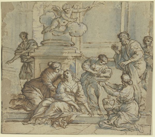 Curator: Ugo da Carpi's "Jesus in the House of Simon, The Pharisee" strikes me immediately as dramatic, almost theatrical. The chiaroscuro—that bold contrast between light and dark—pushes all the figures forward. It’s an image packed with both tension and a strange sort of intimate tenderness. Editor: This print, realized sometime between 1480 and 1532, presents us with a visual articulation of class tensions within a sacred narrative. Da Carpi translates this key moment, placing Jesus amid societal scrutiny, highlighting a discourse on religious propriety and social reform. The very act of creating prints like this one democratized access to such scenes. Curator: Democratized! Precisely. Prints made it portable, digestible. I feel the story anew, a ripple effect of seeing it passed on. Even with this monochrome treatment, the way the characters interact and how it's portrayed here lends it an air of timeless drama. Look how present Jesus is, hands outstretched, engaged with... well, chaos really. Editor: Right, and that's crucial! Da Carpi’s utilization of the chiaroscuro technique does not merely amplify the drama. Rather, it accentuates the divisive climate inherent to the gospels and even reflects the religious upheavals simmering in Europe. The narrative choices Da Carpi made invited viewers into the heated socio-religious dialogue unfolding beyond the walls of the gallery. Curator: Mmh, indeed. It is hard to not connect it back to the broader debates of its time. Even so, beyond its polemic value, to me there's something touching about the scene of the woman at Jesus's feet. You can almost sense the weight of expectation in the other figures, too, watching, waiting. Does it ever feel like a snapshot in history or a real scene, or what? Editor: Exactly. I consider works like this from Da Carpi as potent intersections where religious history intersects with social commentary and artistic innovation, capturing a visual glimpse of our ever-changing understanding. Curator: Well, it definitely puts me in the center of the narrative. Thank you for unveiling additional elements!
