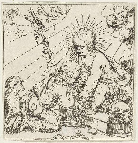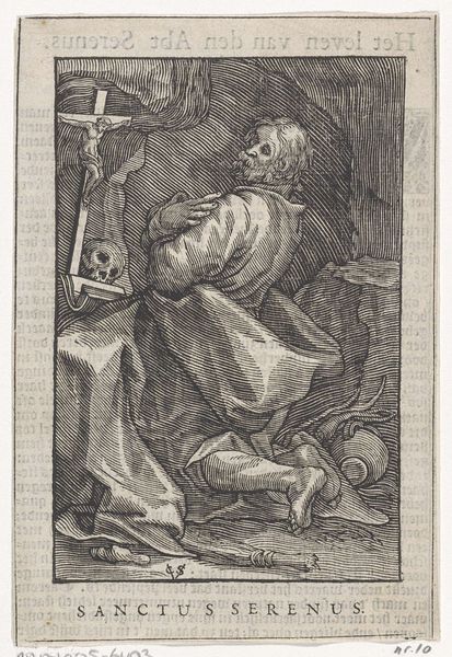 Editor: This is Antoine Sallaert's "Matteüs de evangelist," created sometime between 1590 and 1650. It's a Baroque engraving. It seems to capture a moment of divine inspiration, but what strikes me is how the lines themselves create the drama and texture. What do you see in this print? Curator: This piece screams material production! Look at the tools depicted - the quill, the inkwell. They highlight the *process* of creation, the very labor involved in spreading the word. How do the means of creating such artworks get consumed by an elite class and made more widespread through printing? It calls into question who controls the means of disseminating not just information, but artistic representation, at the time of its making. Editor: So, you are focusing on the cultural implications of its distribution as an engraved print, instead of its spiritual essence. It's interesting that the image of the evangelist actually calls our attention to labor of printing and dissemination...almost an early form of media criticism. Curator: Precisely. This engraving speaks to the socio-economic conditions of artistic production. Think about the engraver's skill, the workshop setting, and how prints democratized access to religious imagery – disrupting the exclusivity previously held by painting. This image served a devotional purpose, yes, but it’s equally a *product* manufactured through specific, and changing, means of cultural and material distribution. What labor made it accessible? Editor: That's a powerful reinterpretation! It reframes a seemingly pious image into a commentary on labor, technology, and access in the late Renaissance or early Baroque. The artist's means are, literally, the message! Thanks for pointing out this undercurrent. Curator: And thanks for noticing its immediate presence and impact! It’s a crucial question for all artwork: who made this and for whom was it really made, materially and politically?