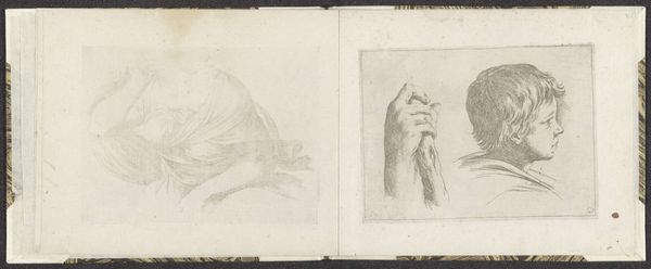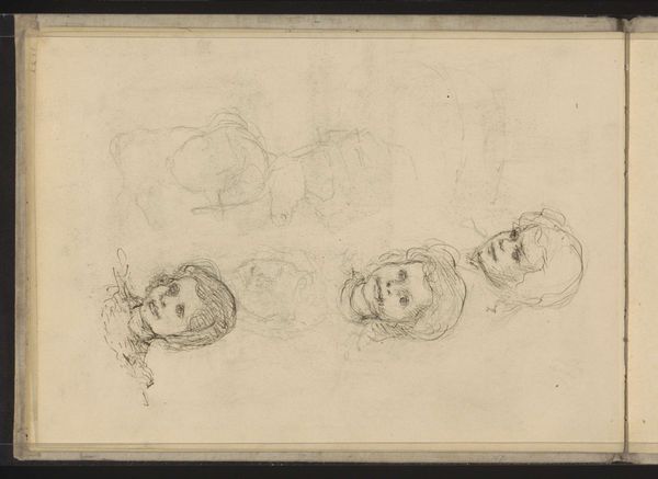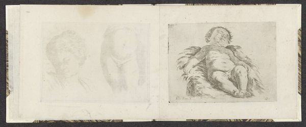 Editor: Here we have Giuseppe Maria Mitelli's "Two Women's Heads", dating back to around 1663-1666, rendered in ink on paper. The sketch-like quality of the drawing gives it a very personal feel. What strikes you most about this piece? Curator: I am interested in how Mitelli uses such modest materials, paper and ink, to explore figuration. The sketch-like quality points to the labour involved in artistic production, and suggests this work might be from a personal sketchbook rather than meant for public display. It is about material access and experimentation rather than the achievement of any one finished product. The incomplete character challenges typical notions of 'high art'. Don't you find the aged paper particularly significant in the overall experience? Editor: Definitely. The aged paper contributes to a sense of intimacy and a tangible link to the artist's process. The visible texture hints at a personal and iterative process. But isn't there also an interesting contrast between the "lowly" materials and the almost idealized form of the women’s faces? Curator: Precisely. Mitelli is playing with that boundary, taking what was traditionally considered a 'minor' or preparatory medium and using it to explore classical themes, or idealised human forms. This subverts established hierarchies within the art world concerning value and artistic labour, and suggests the possibilities opened through drawing. Editor: I see your point. Thinking about the paper and ink elevates what I initially perceived as simply a practice sketch to a deliberate act of material engagement and social commentary. Curator: Indeed. What appeared to be just a sketch is, in fact, rich evidence of the artistic production of the time, revealing a good deal about how the boundaries between high and low were being renegotiated through the artist's creative use of humble materials.
