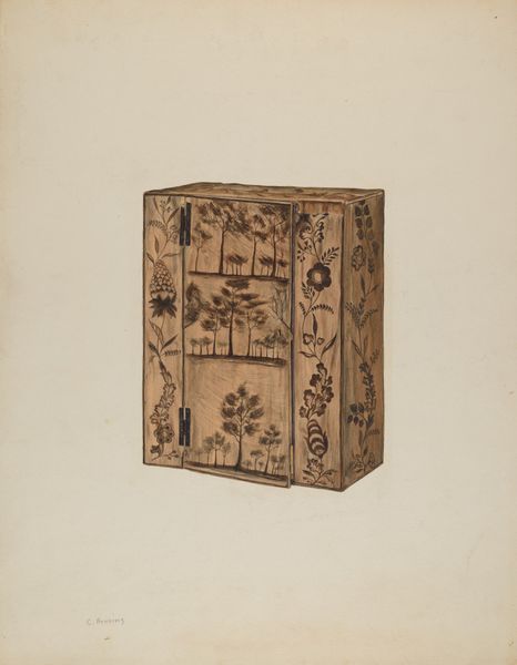 Editor: This is Frank Fumagalli's "Box," from around 1939, created with watercolor and drawing. It feels like a glimpse into a specific object, a container, perhaps precious, but it's represented quite simply. What stands out to you? Curator: What I find interesting is the rendering of this "Box" as a commodity, accessible and seemingly divorced from its actual function or origins. The use of watercolor suggests accessibility, mass production— a far cry from the laborious, perhaps secretive, construction of the box itself. Editor: So, the medium itself comments on the idea of value? Curator: Precisely. The image replicates the object in a medium that diminishes it; turning labor into something consumable. Look closely – what sort of labor do you imagine went into producing an actual box like this, versus this representation? Editor: I see your point. The box seems ornate, maybe hand-carved with a metal clasp; but the watercolor makes it feel almost… common. Curator: And that interplay, the tension between perceived and real value, the depiction and the tangible artifact – it brings to mind the social stratification and the shifting definition of "luxury" in the late 1930s, right before the world once again was reshaped through war. Editor: It's fascinating how focusing on the materials and their contrast unlocks a much broader social commentary! I will look differently at watercolor now. Curator: Indeed. By focusing on the material conditions of its making, a "simple" drawing opens onto an entire world of production, value, and social hierarchy.