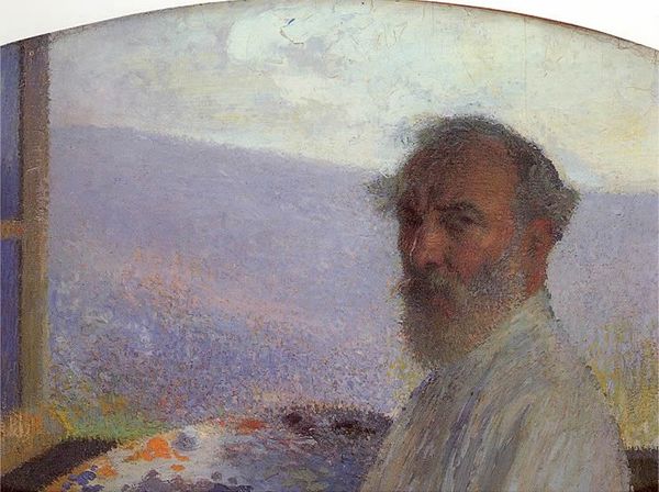 Curator: Henri Martin's "Self Portrait in the Garden" presents us with a fascinating image to consider. Editor: My first impression is one of shimmering light. The composition feels almost entirely built from color, a vibrating surface of dappled light and shadow. Curator: Indeed. What strikes me is how the means of production reflect the socio-economic context. Martin, a well-established artist by this point, is quite literally capturing leisure—a privilege afforded by his profession. His artistic labour and materials enable this very representation. Editor: That's an interesting point. From a formal perspective, the application of the oil paint through a pointillist technique creates a kind of optical mixing. Colors appear more luminous, edges soften and dissolve, giving the painting a dreamlike feel. The careful composition emphasizes the face in harmony with nature. Curator: Right, the technique mirrors a move towards mechanization; the repeatable brushstrokes suggesting a parallel to industrialized processes, while also hinting at nature being cultivated for artistic, leisure purposes. Editor: There’s also the symbolic aspect; the garden—a traditional Eden, is transformed into an artists’ domain. I mean the beard and hat immediately convey that stereotype to a viewer, establishing Martin himself within it, a clear connection that feels very intentional. Curator: This work participates in creating the artist persona, the labour involved being a strategic action within art world dynamics. He creates an appealing portrait but controls the distribution, visibility and inevitably, the capital that accrues. Editor: That control certainly resonates. Yet, it’s the interplay of complementary colors—the reds of the flowers against the greens of the foliage that really capture the essence. Curator: Absolutely. It's about how the production creates visibility in a culture dominated by certain classes. What lingers with me is the material relationship between the canvas and the artist. Editor: For me, it's the way the composition’s optical play captures something profound about sight and subjective experience.