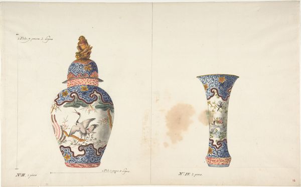 Editor: This is a design for five vases, dating back to between 1765 and 1790, currently residing at The Met. It's rendered with watercolor, drawing, and print. I’m struck by how the designs suggest a progression, from fully realized to barely outlined. What catches your eye about this piece? Curator: I find the material reality of this "Design for Five Vases" fascinating. Look at the paper itself - its likely handmade, of a specific weight and texture to accept the watercolor. Consider the pencil and watercolor: were they readily available, mass-produced, or costly and rare, reflecting a specific patron and context? Editor: That's an interesting point about the materials dictating its production! Curator: Precisely. This wasn't simply artistic inspiration; the production, sourcing, and inherent values imbued in the raw materials influence the artistic outcomes. What level of skill would be required to both create and execute this plan into porcelain or other finished product? Are they using assembly line processes in the 1700s? How much labour did each phase demand? It hints at broader issues of production and consumption during the late 18th century. Editor: So you're saying understanding the materials helps us understand the whole system around it. Curator: Absolutely. The choice of materials, the methods of their application, and even the depiction of the objects – all speak volumes about the socio-economic realities and power structures of that era, shifting boundaries between design, craft, and ‘high art’. Editor: I never thought of design that way before. Curator: Thinking about the art's manufacture alongside it artistic merit truly allows us a more grounded perspective, doesn't it? Editor: Definitely. Thanks for making me think about art more deeply!