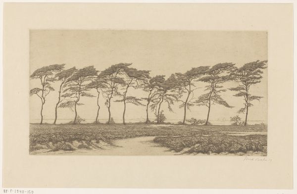 Eugène Cicéri designed this stage set with watercolor and graphite on paper. The design presents us with a sequence of trees against a pale sky, each rendered with subtle gradations of color that convey depth and volume. Cicéri masterfully employs line and shading to articulate the texture of the bark and the density of the foliage, creating a compelling illusion of three-dimensionality on a two-dimensional surface. The composition's structure is a delicate balance between naturalism and artifice. The ordered placement of the trees and the calculated recession into space suggest an underlying formal rigor that belies the apparent spontaneity of the watercolor medium. We might consider how the work destabilizes established meanings by blending the boundaries between nature and design, inviting reflection on representation and perception in the theater. The artist challenges us to think about space and representation. Notice how the structured arrangement of the trees and the intentional handling of the material serve to reinforce its status as a work of artifice, inviting ongoing interpretation.