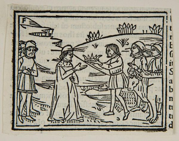 Editor: Here we have "Illustration LIII," by an anonymous artist, housed at the Harvard Art Museums. The figures seem to be exchanging documents near a shore. How would you interpret this scene in light of its historical context? Curator: Given the style, this likely served an illustrative purpose, perhaps within a book. Note the figures' clothing; it suggests a specific social class. Who are these men, and what power dynamics are at play? What do you think the document signifies in their interaction? Editor: Perhaps it's a transaction of some kind, or an agreement being formalized? Curator: Precisely. Consider how such imagery, distributed through print, shaped public understanding and reinforced societal structures of the time. The anonymity of the artist also speaks volumes about the role of art production back then, wouldn’t you agree? Editor: That makes me think about the purpose and meaning behind even seemingly simple illustrations. Thanks for your time!