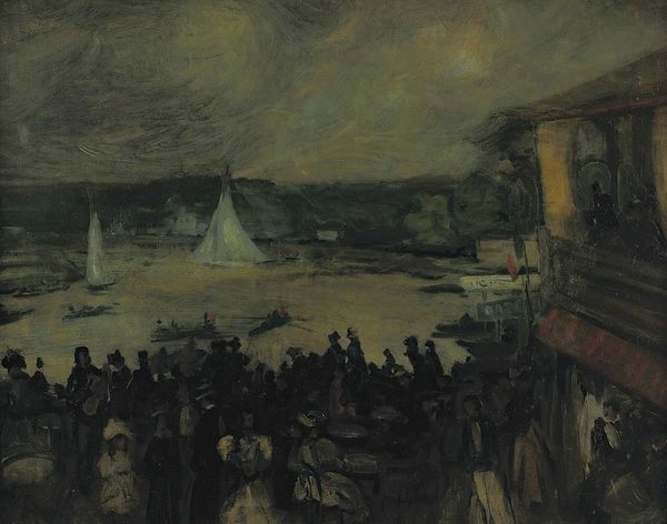 Curator: Sir Gerald Kelly's "Beach at Etretat," now residing at the Tate, captures a fleeting scene with a support measuring 216 by 270 mm. Editor: It's like a hazy dream. Muted colors, figures almost dissolving into the background. There's a strange serenity, almost melancholy, to it. Curator: Indeed. Note how Kelly uses broad strokes, almost impressionistic, to render the crowd and the architecture. It’s about capturing a moment, not precise detail. Editor: The lack of sharp lines pushes the eye around—a sea of bonnets bobbing like whitecaps mirroring the water, those dark smudges of figures grounding the composition. It's as if the whole beach is exhaling. Curator: Precisely. The composition guides us: horizon line, then the beach, then figures as a mass. It’s a calculated simplification. Editor: It feels like a memory fading. Makes you wonder what Kelly was trying to hold onto, or let go of, by painting this beach. Curator: It gives us so much room for personal reflection, doesn't it? Editor: Absolutely. It whispers where others shout.