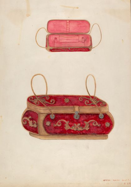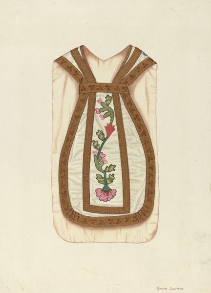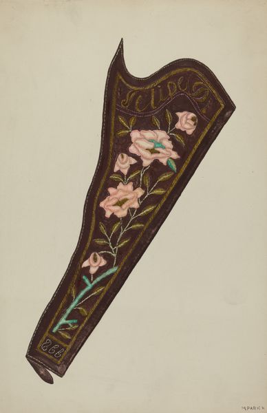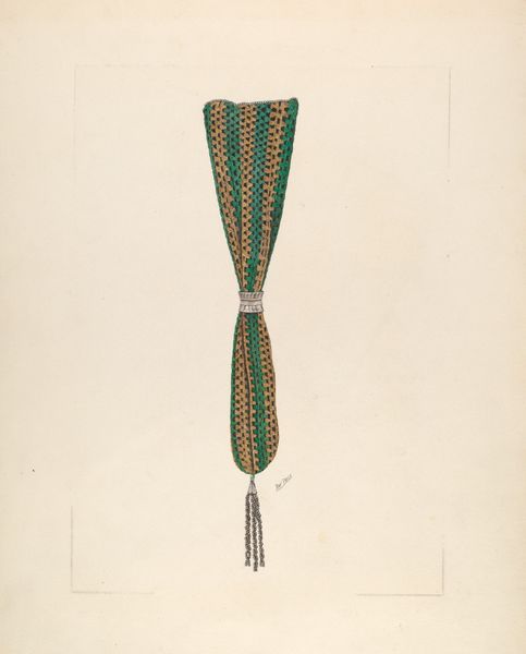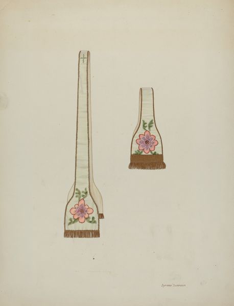 Dolores Haupt created this watercolor and graphite depiction of a suspender, its date unknown. The suspender's linear form is immediately striking, defined by its verticality and symmetry. Haupt meticulously renders the suspender with a flat, frontal perspective that invites close inspection of its materiality. The composition is divided into distinct zones, with the floral embroidered straps creating a visual rhythm. The choice of pastel hues and delicate brushstrokes suggests an interest in exploring themes of domesticity and the decorative arts, often overlooked in the hierarchy of artistic subjects. The suspender becomes a signifier, laden with cultural meaning related to gender, labour, and the body. Through the formal representation, Haupt elevates the status of this mundane object, challenging the conventional boundaries of fine art and craft, and questioning fixed notions of value.