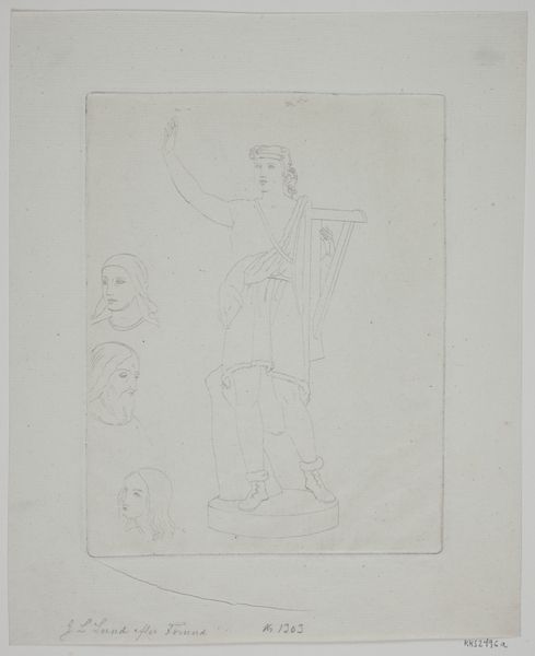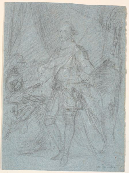 Curator: Standing before us is John La Farge's "Study for a Stained Glass Window," dating back to around 1875, now residing here at the Art Institute of Chicago. What strikes you first? Editor: Its raw, almost provisional quality jumps out. It feels like a glimpse into the artist's mind – all the sketched lines and suggested details. Like seeing the scaffolding behind the masterpiece, it immediately signals a complex material project about to come into existence. Curator: Exactly. There's an energy in its incompleteness, isn't there? Knowing that this would become a vibrant stained-glass window adds another layer of depth. La Farge was wrestling with how to capture light and color on this other level, using glass as a medium. The labor and craft involved would’ve been considerable. Editor: Absolutely. I am thinking about the social context. Glass production and manufacturing at the time would've relied on highly specialized artisans and skilled workers. To think of them alongside La Farge, figuring out techniques of production and methods of distribution gives us access to history. Curator: La Farge wasn't afraid to experiment with techniques, including opalescent glass, to achieve richer, more varied color effects. This drawing likely served as a crucial step to test compositions and light dynamics to that degree. You almost imagine him holding it up to the light... picturing the whole effect. Editor: But it’s more than that—a drawing gives a lot of indications. I’m reading the inscriptions along the frame—he's planning “leading.” Also note he labels it as meant "for Harvard Memorial Hall from the full size cartoon." I think his method reflects this need for clarity on top of art-making—an instruction manual. Curator: The classical figure—possibly Epaminondas as the inscription notes—holds such gravity. La Farge imbues the image with something deeply symbolic – this valorous subject combined with glass as material lifts the subject up even higher. Editor: It does show a different relationship to the concept of material; in some sense, La Farge also attempts to elevate the value of laboring with his hands and ingenuity... there is something democratic to his method that might have something interesting to say about how art intersects social life. Curator: That's such a great way to see it, actually – considering how the final work embodies and honors more than the original sketch ever could. I will never look at La Farge’s works again! Editor: For sure, looking at how artists transform materials to transform their own visions is the start of something grand.