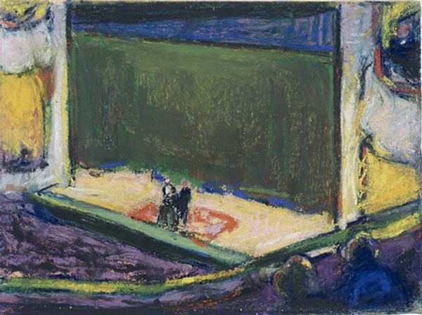 Curator: Egon Schiele painted "Mein Wohnzimmer," or "My Living Room," in 1911, using oil paint to create a striking, if somewhat unsettling, interior scene. Editor: Unsettling is right. There's an almost frantic energy to it. The colors are muted and sickly, and those heavy, dark outlines… It feels claustrophobic. Curator: I think the immediacy is achieved precisely through his application of the oil paint and how he leaves certain portions looking unfinished. Look at the visible brushstrokes and the seemingly crude construction of forms. There's little illusionism here. We're keenly aware of the process, of Schiele wrestling with materiality. Editor: True. And while that rawness conveys emotional intensity, I can't help but see symbolic weight here too. Take the objects themselves: a patterned vase, dishes… They feel almost like relics, imbued with some sort of hidden, domestic significance. Curator: Do you read it as some autobiographical statement, perhaps relating to the socio-economic context in which he operated, since Expressionist artists commonly blurred distinctions between the home, studio, and storefront? The studio was not only for art but a place of experimentation with craft and business. Editor: Perhaps. Or consider that stark, black rectangle. Is it a window? A mirror? Maybe it reflects Schiele's own brooding gaze back at us. Even the colors, that dominant ocher, could suggest a kind of spiritual aridity or malaise, reflected in other iconic modern works as the nothingness felt across Europe. Curator: Right, that tension between surface appearance and meaning... Even his rapid execution of this and related works reveals the challenges inherent in commodifying artwork, a phenomenon that certainly affected Expressionist circles during that period. Editor: Well, it's certainly successful in communicating a feeling that sticks with you, long after you've moved on from the canvas. It captures, through these material applications, a psychic discomfort. Curator: Absolutely. Thinking about the intersection between Expressionism's material process and this era makes me look at everything Schiele crafted in a totally different light.