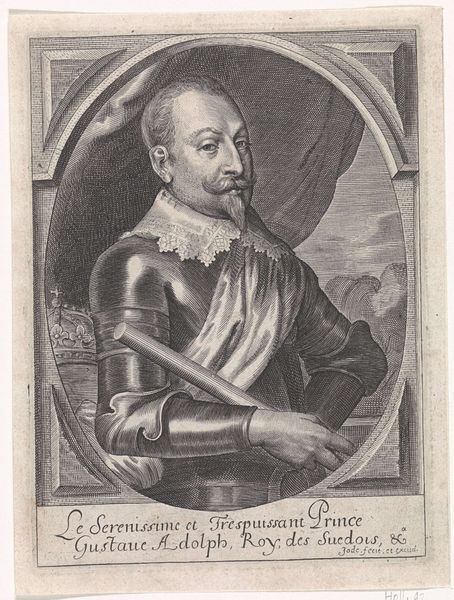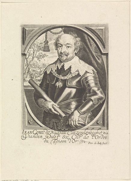 Editor: Here we have a finely detailed engraving, "Portret van Johan VIII, graaf van Nassau-Siegen," by Pieter de (II) Jode, dating sometime between 1628 and 1670. The armor and lace collar immediately give me a sense of Baroque grandeur, yet there's also an intimacy in the way he holds the baton, a symbol of authority perhaps. What catches your eye most in this portrait? Curator: The contrast between the meticulously rendered details of his armor and the more loosely sketched background is compelling. Almost like reality is solid but history remains a sketchy afterthought. The gaze seems to hold both pride and, dare I say, a touch of weariness. I wonder what burdens that fancy collar conceals? Do you sense that weight? Editor: I do, now that you mention it! He's not just posing; there's a lived-in quality to him. That weariness you mentioned is pretty visible actually. Almost as though the weight of being a count has taken a toll. Curator: Precisely! Engravings like these were often commissioned to solidify legacies. I see Pieter de Jode grappling not just with representing status but the human beneath it all. Is it glorifying or humanising? Or possibly a bit of both? Does that question maybe change how you interpret it? Editor: It definitely makes me think beyond the initial impression of just a historical figure. It's like the artist is hinting at the complexities of power and personality. I was too quick to think “grandeur,” but there's more here. Curator: Indeed, sometimes the grandest portraits whisper the most intimate secrets. What a marvelous way to spend an afternoon together discovering new dimensions to art! Editor: Absolutely, a reminder to look beyond the surface! This portrait’s subtlety really struck me and highlights how initial impressions can be misleading. Thanks so much for enlightening me about how appearances and what lies beneath.