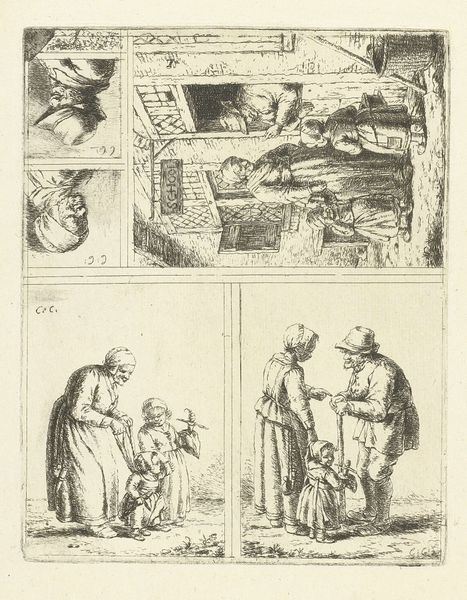 Curator: Looking at this print by George Cruikshank, we see two scenes from Cinderella, one above the other. It's titled "The Pumpkin, and the Rat . . .," and it captures the magical transformations central to the fairy tale. Editor: Ah, the energy! The top scene, with the fairy mid-spell, feels almost frantic. It's like a whirlwind of potential, don't you think? Curator: Absolutely. Cruikshank's style, with its detailed line work, emphasizes the chaotic nature of magic disrupting everyday life. And it places the kitchen as a stage for social mobility. Editor: Right. A pumpkin, a rat, a kitchen, suddenly elevated to something of utmost importance. Makes you wonder about all the hidden potential in the mundane, doesn't it? Curator: It really does, yes. And Cruikshank, though popular, was also quite critical of societal superficiality. Perhaps he saw a bit of himself in Cinderella, trying to make a statement. Editor: Perhaps! A reminder that sometimes, all it takes is a little magic – or a lot of hard work and luck – to change your story. Curator: And that the symbols of transformation can be found in the most humble places.