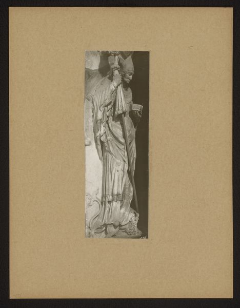 Adolphe Giraudon made this photograph of a sculpture of Saint Firmin, originally from the Notre-Dame cathedral in Amiens. Images such as this tell us about the cultural importance of religious figures and the role of the church within French society. The sculpture itself, likely dating back to the Gothic period, serves as a visual representation of faith and authority. Saint Firmin, depicted with his bishop's staff, embodies the power and influence of the church. Amiens Cathedral was a significant religious center, and sculptures like this were integral to the cathedral's identity and the religious experience of its visitors. The photograph was probably commissioned to document the cathedral's artwork. To understand this image fully, historians would research the history of the cathedral, the life of Saint Firmin, and the artistic conventions of Gothic sculpture. By studying the social and institutional context, we can gain a deeper appreciation for the cultural significance of this photograph and the artwork it depicts.