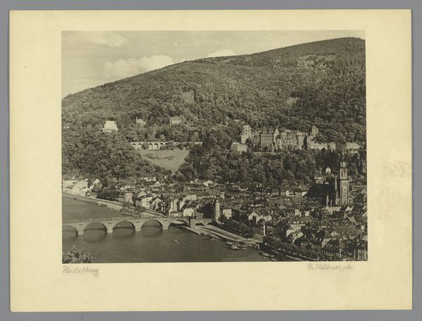 Curator: Oh, it feels like stepping into a dream! Everything is dipped in a hazy monochrome, a gentle whisper from another era. There's a soft romantic quality that seeps from this image like fog on a riverbank. Editor: What captures my attention is how this landscape reflects an emergent civic consciousness. Let's start with the basics. This gelatin silver print, taken sometime between 1880 and 1920, presents a sweeping view dominated by the town, but it is really a case study in the growth of Heidelberg itself. Curator: Ah, Heidelberg! That explains the imposing structure nestled amongst the trees...the castle ruins looking like a forgotten memory carved into the hillside. The long exposure lends such a poetic touch, blurring the details, almost as if time is trying to erase its secrets. Editor: Right, and consider how the seven-arched bridge becomes a symbol of connection—linking the old city with burgeoning areas beyond. Note the careful attention given to rendering buildings and monuments with detail—this communicates values of progress and cultural authority. The image seems invested in the urban narrative itself. Curator: Definitely, but isn’t it interesting how despite this emphasis on city structures and all that social context you mention, nature persists, perhaps even resists complete domestication. See how the mountain behind softly dominates, whispering of something far beyond municipal reach. It's a visual dialogue between progress and something...unchanging. Editor: And consider that such pictorialist techniques, as seen here, came as photography wrestled its place against painting. Soft focus became an emotional language with direct correlations to social themes of modernization; there's a kind of idealized harmony between people and place being expressed here that might serve a city's ambitions, you know? Curator: An ambition seen through a romantic lens, perhaps! All that fuzziness adds to the feeling, transforming reality into art. Makes one want to be right there, breathing the mountain air, maybe philosophizing on the Philosophenweg itself. Editor: It certainly draws one into considering Heidelberg’s transformations—urban spaces remade according to certain dominant ideas and ambitions. I am left pondering what has been preserved...and what stories this photograph silences in its selective portrayal. Curator: Well, either way, there’s undeniable magic lingering in its grayscale world. It stirs the soul, you know? It just does. Editor: Yes, but one can't help but look and listen carefully at the complexities it embodies—its blend of artistry and purpose. It challenges our engagement with place itself.