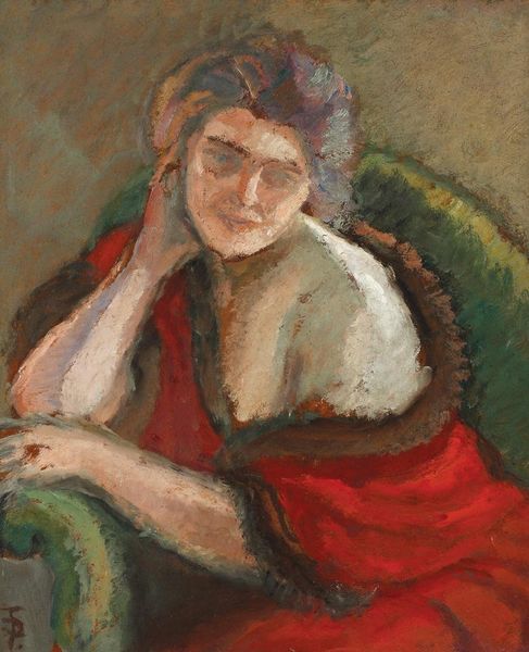 Editor: Here we have William Glackens' "Woman Seated on Red Sofa," painted around 1912 or 1913. The impasto is really striking, it looks so thick. What can you tell me about it? Curator: Well, first notice the materials: oil on canvas. Glackens’ application isn’t just about aesthetics; it’s a declaration. This isn’t the polished surface of academic painting; it’s about showing the labor, the very physicality of applying paint. How does that materiality impact the image for you? Editor: It makes it feel less formal, somehow. Almost unfinished, raw. I guess it brings the actual *making* of the painting into focus. Curator: Exactly! And that rawness aligns with the changing social landscape of the time. Consider the rise of industrial production and mass consumption. Glackens is, in a way, refusing to create a perfectly polished, easily consumable image. He's showing you the brushstrokes, the labor, the human element. Think about the difference in cost between these new synthetic colors and the pigments of previous generations of artists. The accessibility afforded to these artists had an impact. Editor: That makes a lot of sense. So the medium is part of the message? Almost like the painting itself is performing its own making? Curator: Precisely. It is a commentary, maybe unconscious, about the rapidly changing material culture. Also, think about the red sofa. The choice of material – plush velvet, a signifier of burgeoning bourgeois comfort. Glackens juxtaposes the sitter with the *stuff* that enabled that leisure. Editor: It's amazing how thinking about the materials and production gives us so much to consider. I never would have seen that just looking at it! Curator: Exactly. By exploring these aspects of making and materiality, we start to perceive art less as simply objects and more as complex cultural products reflecting the realities of labor, consumption, and social status.