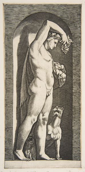 Editor: This is an engraving by Marco Dente, made sometime between 1510 and 1532, titled "Olympus naked seated on a tree stump holding pipes, set within a niche." The starkness of the figure, and the precise lines of the intaglio, make it a study in contrasts. What do you see when you look at this piece? Curator: Formally, the piece presents a fascinating study in the interplay of light and shadow. Note how Dente uses hatching and cross-hatching to sculpt the figure's musculature, creating volume and depth. The sharp contrast between the illuminated figure and the shaded niche emphasizes the three-dimensionality of the subject. The figure's contrapposto pose adds dynamism and visual interest, further engaging the eye. How does the figure's gaze influence your interpretation of the piece? Editor: I hadn't considered the contrapposto. His downward gaze does seem to make him introverted or pensive, contrasting with his nakedness and the implied sound of the pipes. The detail of his toes is interesting too. Does it seem idealized for the time? Curator: The slight elongation of the figure is indeed reminiscent of Mannerist tendencies that began to emerge in the later Renaissance. Though Dente closely followed the composition and style of Raphael, and the subject follows an earlier prototype, we see this artistic interpretation influencing the visual language. Considering that visual element in relation to the thematic elements, how does this refinement of forms shift the content’s semiotic impact? Editor: That’s interesting to consider. It pulls in so many different layers of understanding to focus just on the form itself. Curator: Exactly. Appreciating how the details contribute to a deeper and more holistic perception enriches the art experience. Editor: Thanks for your perspective! It highlights a whole range of things I never noticed.