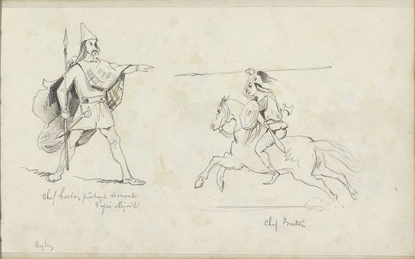 Curator: "Paard en ruiters"—Horses and Riders—an 1840 pencil and ink drawing by Johannes Tavenraat here at the Rijksmuseum. Editor: My first impression? Ethereal. Like capturing ghosts in motion, you know? These riders aren’t really *there*, yet I feel the phantom thundering of hooves. Curator: It's fascinating how Tavenraat captures movement. He wasn't interested in hyperrealism, as you said, more of capturing energy itself. This came at a time when landscape art, and its intersection with depictions of the ‘noble savage’, were both powerful modes in Dutch visual culture. Editor: Yes, I’d agree! There's such a dreamy, romantic sensibility to these drawings. And even a hint of orientalism, a whiff of a world unseen and idealized? What do you reckon about it? Curator: Absolutely. It invites viewers to contemplate not just equestrian skill, but also how the so-called “oriental” rider fits in with colonial structures of domination. How do we negotiate this exoticism? It is hard, especially if we remember it used to hang on some rich person's wall who may have benefitted from those colonial exploitations... Editor: That's powerful! And that links beautifully to the immediacy of his strokes; the quick lines evoke the swift, fleeting nature of travel, almost like an on-the-spot impression that transcends the artist’s background and personal narrative. A really great combination! Curator: Perhaps Tavenraat sought to probe at what happens when landscape, animals, and men meet? How these types interact and build the environment and, by extension, the stories that bind cultures together. Editor: Maybe. What this piece is saying isn’t super-specific; like a half-remembered dream you had just moments after waking, open to infinite subjective takes. Curator: This has provided new avenues of thought for me on the power of art, regardless of subject. So important to remember that artists can explore their imagination without constraints. Editor: It seems to me this piece invites to contemplation and interpretation to viewers. I wonder what they feel.