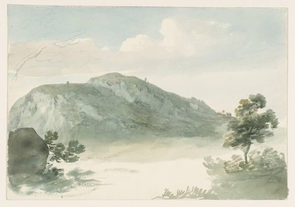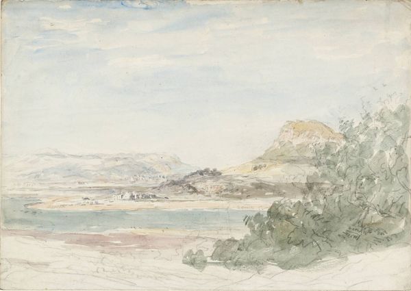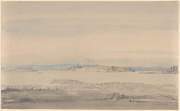 Editor: Here we have Nicholas Pocock's "Sandown Bay" watercolor. It feels so light and airy, almost like a dream. What do you see in this piece? Curator: Note the work's emphasis on horizontal lines—the shore, the sea, and the distant landmass. How do these layers interact formally? Editor: I guess it creates a sense of depth and distance, but why so muted? Curator: Indeed. Pocock employs a limited palette, favoring soft blues and grays. Consider how this monochromatic approach contributes to the overall atmosphere and the work's structural unity. Editor: So it's about how the colors work together more than what they depict? Curator: Precisely. It reveals the formal relationships defining the artwork. Editor: That’s a fascinating way to look at it!
