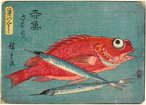 Utagawa Hiroshige created this woodblock print titled 'Yellowtail and Rockfish'. Its composition is strikingly simple, featuring two fish against a solid blue background. The arrangement—one fish above the other—divides the space horizontally, inviting immediate visual comparison. The rockfish at the top, rendered in shades of red and pink, has a textured skin effect, achieved through careful layering of the ink. Notice how this contrasts with the smooth, streamlined form of the yellowtail below, which is depicted in cool blues and greens. These choices in color and texture are not arbitrary. They serve to highlight the distinct characteristics of each species, creating a dynamic interplay between the two. The simplicity of form allows for an exploration of the essence of each fish, inviting contemplation on nature and representation. The print's aesthetic economy allows for a close study of form, color, and texture.