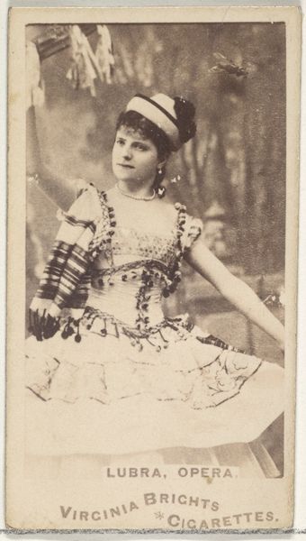 This is a photograph of Jas. T. Powers, from the Actresses series, made around the late 19th century by Kinney Brothers Tobacco Company as a promotional item for Sweet Caporal Cigarettes. These cards were a clever way to increase sales, capitalizing on the popularity of actresses and the burgeoning culture of celebrity. Consider the social context: in an era before mass media, these cards offered a glimpse into the glamorous world of theater and entertainment. The actresses depicted were tastemakers, their images shaping ideals of beauty and style. The Kinney Brothers Tobacco Company was tapping into the growing consumer culture, using art to build brand recognition. To truly understand these cards, we might delve into business archives, theater programs, and fashion magazines of the period. What we learn is that even a small image like this offers a window into the economic and cultural landscape of its time.