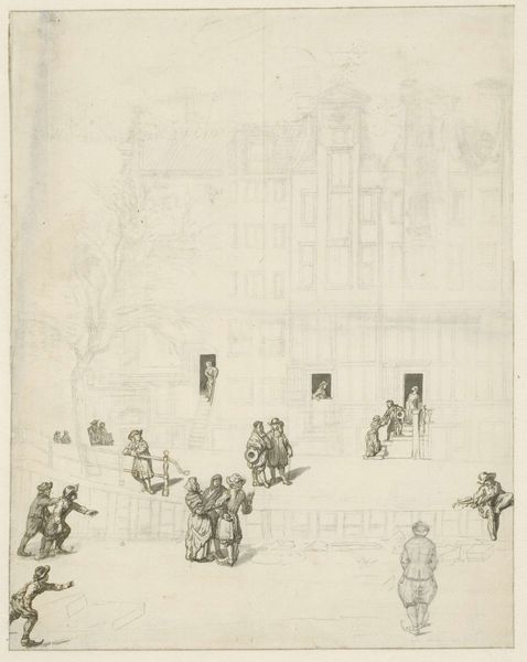 Curator: This pen and ink drawing offers a glimpse into a tumultuous episode in Amsterdam’s history. Entitled “Plundering van het Pintohuis tijdens het Aansprekersoproer te Amsterdam, 1696”, it was created by Simon Fokke between 1779 and 1781. Editor: My first impression is chaotic energy, even in the static lines of the drawing. You can practically hear the mob's shouts, or the breaking glass. It’s really evocative, despite the simple medium. Curator: Indeed. It depicts the 1696 riots sparked by funeral announcers, or "aansprekers", who protested reforms that threatened their livelihood. The scene centers on the ransacking of the house of Isaac de Pinto, a wealthy Jewish merchant. This imagery became politicized through its subsequent use as an anti-Semitic propaganda tool. Editor: It’s fascinating how a simple pen drawing becomes a political object, especially when we consider the physical effort behind it. You know, the preparation of the ink, the sourcing of the paper... those things aren't always at the front of one's mind when thinking about such refined forms. Curator: Precisely. Fokke's drawing participates in a broader trend of history painting in the Netherlands that romanticizes or moralizes such events for a viewing public. Here, it’s presented almost as a genre painting – capturing a supposedly authentic slice of Amsterdam life. Editor: What really strikes me are the textural qualities Fokke coaxes from seemingly simple materials. Note the details in the clothes, contrasted against the more rigid lines depicting the building itself. These are direct choices that elevate certain facets of life over others. There’s a dialogue between order and disorder expressed materially in that contrast. Curator: And that contrast underscores the very social and economic fault lines exposed by the riot. It demonstrates a fear of commerce held by parts of the working class. It really illustrates the precarity of certain crafts during periods of urban reform. Editor: I agree, and I also think focusing on materiality reminds us that Fokke, the artist, isn't just passively recording here – his selection and preparation of the materials contributes directly to our impression. The rioters and buildings are depicted through particular social and artistic traditions of the period. Curator: Considering the layered history of the image, and Fokke's choices in portraying it, helps reveal the complexities embedded within this seemingly simple snapshot of a past event. Editor: Absolutely. It really shows how an artwork is a convergence of labor, material, and sociopolitical narratives.