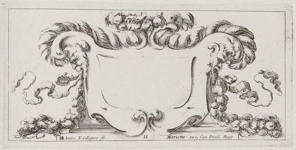 Curator: This is "Cartouches," an engraving by François Collignon. The dimensions are relatively modest. What's your first take? Editor: It feels almost playful, but with a hint of underlying tension. The cherubs seem to be struggling with something. Curator: The cherubs and animal heads are strategically placed, framing what would typically be a space for text or a coat of arms. The lines are meticulous, indicative of the printmaking process. Editor: Right, the blank cartouche invites questions about power, the relationship between the monarchy and its representations, and the labor that goes into constructing those images. Curator: It's a fascinating example of how even seemingly decorative elements can carry complex social and political weight. Editor: Indeed. It's a reminder that what's left unsaid can be just as powerful as what's explicitly stated. Curator: I find myself drawn to the craftsmanship and the artist's hand in shaping these materials. Editor: For me, it's about what this piece tells us about the era's values and power dynamics.