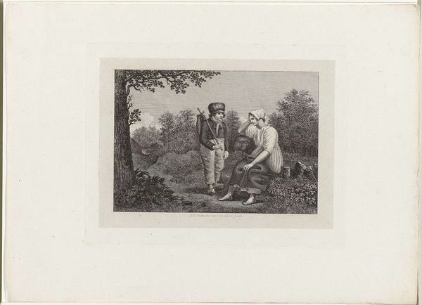 Curator: Here we have Simon Fokke's "Twee heren in de natuur," or "Two Gentlemen in Nature," an engraving that was completed sometime between 1722 and 1784. Editor: It strikes me as a very quaint depiction of leisure. The scale and monochrome palette give it an understated elegance. Curator: Exactly. Fokke's manipulation of line is particularly striking. Observe the density and directionality. Notice how the fine lines of the engraving create tonal variations across the landscape, defining the volume of the trees and the folds of the figures' clothing. Editor: The clothing seems very important to understanding their position. It seems that the social production of the fabrics themselves and the tailoring would be vital. The fact that these men are afforded the leisure time to wander the landscape attests to a life of material comfort and class privilege. The details aren’t accidental, either. Curator: That tension is reflected, too, in the formal balance of the composition. The artist positions two figures in contrapposto as they move towards that large flowering plant, don’t you think? Editor: I would consider how those class distinctions extend into art production, determining which types of labor are more respected or valued. Printmaking itself occupied an ambiguous space in the art world; often, the engraving was produced to cheaply reproduce another artist’s paintings. Curator: Of course. And this work employs figuration typical of the Baroque style while simultaneously offering a rather bucolic genre scene with these figures in landscape. This intersection reflects complex notions of power and pleasure during that period. The artist plays with space, allowing the eye to flow naturally while giving specific attention to these central forms. Editor: Ultimately, what's captured here isn't just aesthetic accomplishment but also social stratification made visible through the materiality of their world. The artist made visible this stratified world with a sharp sense for craft, and his final output shows the means used to show them. Curator: Considering those visual relationships enriches our understanding, allowing us to interpret more deeply the composition. Editor: By considering these aspects together, it gives the work deeper importance.