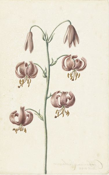 Hans Simon Holtzbecker made this detailed botanical study of a Lilium martagon, or Turk's cap lily, using watercolor and gouache on paper. Holtzbecker worked in 17th-century Northern Europe, a time when naturalism in art flourished alongside exploration and scientific discovery. The image is carefully observed and rendered with precision, typical of the botanical illustration tradition. Yet, it invites us to consider the cultural dimensions of the natural world. In Holtzbecker’s era, flowers were collected, classified, and displayed as symbols of wealth and status. The Lilium martagon, with its intricate, drooping petals, was a prized specimen. Consider how this flower carries stories of trade, colonialism, and scientific ambition. It's more than just an image of a lily; it’s a reflection of our relationship with nature and the power dynamics embedded within it. Holtzbecker’s work reminds us to look closer, to see the complex histories intertwined in what might at first appear simply beautiful.