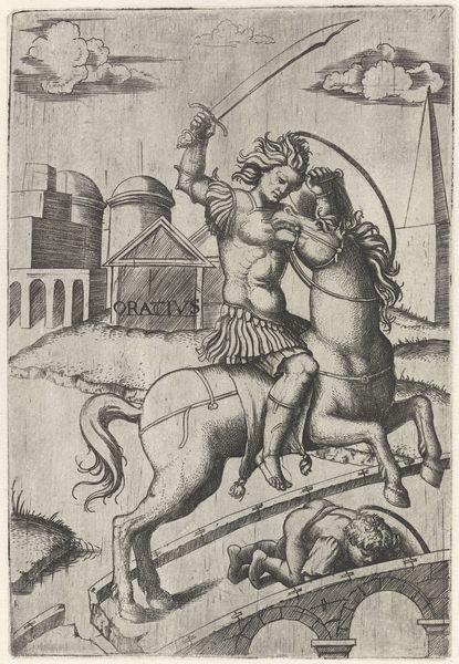 This print, made by Marcantonio Raimondi around 1515, shows Horatius Cocles on horseback, in the process of trampling a fallen soldier. Raimondi was a master of engraving, a printmaking technique that involves incising an image into a metal plate, in this case likely copper, which is then inked and pressed onto paper. The medium lends itself to the sharp, precise lines that define the scene. Consider the labor involved: each line painstakingly carved into the metal, demanding both skill and patience. The process allowed for the mass production of images, playing a crucial role in disseminating artistic ideas and narratives, like this classical scene of military prowess. The texture of the paper, the weight of the ink, and the overall composition contribute to the print's visual impact. By understanding the materials and processes, we appreciate not only the artistry but also the social and cultural context in which it was produced.
