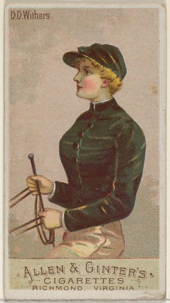 This small chromolithograph of August Belmont, part of the "Racing Colors of the World" series, was printed by Allen & Ginter Cigarettes in the late 19th century. These cards were designed to be collected, depicting the silks of prominent racehorse owners. August Belmont, a financier and diplomat, represents the intersection of wealth, power, and leisure in this era. The card captures the exclusive world of horse racing, a sport deeply entwined with class and social status. Look at the figure, rendered in vibrant red, the color of Belmont's racing silks. These colors are not merely decorative; they signify identity, heritage, and belonging within a privileged community. Produced during a time of rapid industrialization and social change, these cards offer a glimpse into the lives of the elite. Yet, they also reflect the commercialization of leisure and the marketing of identity. It invites us to consider the complex interplay between representation, identity, and consumer culture in shaping societal values.