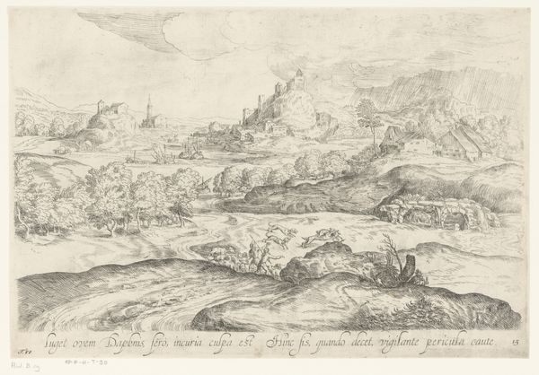 Curator: Here we have an engraving from around the 17th century titled *Landschap met twee ruiters en een ossenwagen,* or Landscape with Two Riders and an Ox Cart, from an anonymous artist. Editor: It's a rather subdued scene, wouldn’t you say? A lot of detail etched with these fine lines creating depth—a quiet sort of industriousness embedded in the very landscape. Curator: Indeed. Landscapes in this period often served as allegories. Note the prominent city in the background contrasted by the agrarian imagery in the foreground. It is evoking the interplay between nature and civilization, maybe even an idealized view of rural life sustained by the trade routes of the town. Editor: An engraving process requires multiple stages, doesn't it? The preparation of the metal plate, the careful incision, the inking and pressing... there's a tangible investment of time and skill reflected in the image. Look at the detail in the ox cart; this speaks to trade as infrastructure, reflecting social organization dependent on the transit of goods. Curator: That cart and those animals can represent more than logistics—perhaps even virtues. The steady ox could embody patience, or the journey symbolizing life’s pilgrimage towards enlightenment. Remember, visual languages used established symbols and what resonates can differ greatly between cultures. The two riders give me the feeling that the composition is suggesting nobility overseeing daily work. Editor: I appreciate that link. You’re also drawing attention to how the image could function as a social commentary. How luxury is constructed, perhaps? Curator: Precisely! An intriguing peek into the symbolic and the real of a long ago existence. Editor: Definitely, the tangible quality of the craft adds layers to its deeper symbolism, it is quite the artifact, to ponder and contemplate.