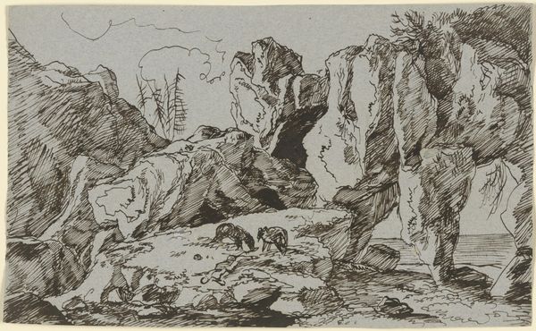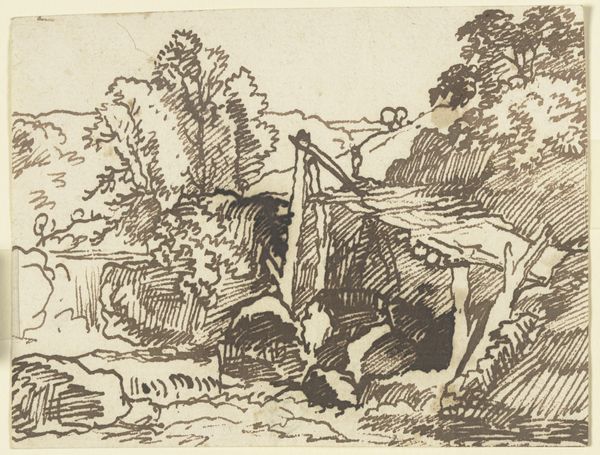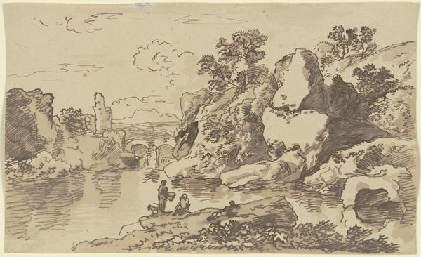 Curator: Here we have Johann Andreas Herrlein’s work, “Ein Hirte mit drei Ziegen, Wassser schöpfend”, currently held in the Städel Museum’s collection. The work, translated to “A Shepherd with Three Goats, Drawing Water” depicts…well, precisely that, in ink and watercolor. What’s your first impression? Editor: There's a delightful sketch-like quality. The composition has a certain roughness to it, but balanced by soft washes. Notice the repetition of strokes defining volume and the texture, which feels so spontaneous. Curator: I think focusing on the spontaneous aspect is essential here. Many Romantic era landscape paintings, especially plein-air works, grapple with notions of immediacy and authenticity. Editor: It's intriguing how Herrlein uses ink to establish the solid structural elements, like the little stone bridge on the left. But then he seems to undermine them by overlaying this somewhat misty watercolor. Curator: He's definitely playing with texture, as you mentioned earlier. Look at how the washes build up a sense of depth on that rocky hillside, which is interesting given how flat much of the rest of the scene appears to be. This contrast creates a compelling spatial ambiguity, but perhaps is influenced as well by a culture and context for “finished” versus “preparatory” pieces of art. Editor: True, the light is wonderfully distributed to unify forms, almost to make one continuous undulating mass, creating a harmony amongst its rustic labor. Is Herrlein depicting actual agricultural work, or is there something else? Curator: Given the timeframe, one might read this in the light of increasingly industrial labor taking the stage; certainly, an idealization of the simpler agricultural ways. How would Herrlein reconcile his choice of subject matter within this rapidly modernizing framework? And the water-drawing theme itself has biblical parallels which should be taken into consideration. Editor: This artwork’s rustic charm contrasts a deep undercurrent about changes in working life at the time it was conceived, rendered masterfully using available means of production like watercolors, inks, and plein air style! Curator: It's interesting to view a drawing like this, as a document of the transition and change which had defined labor at that time. Thank you for providing new ways to see this work!