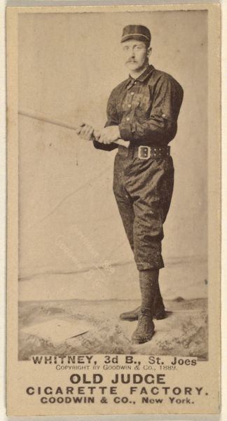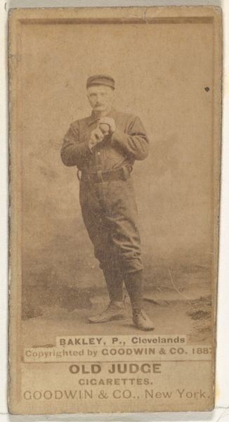 This is an Old Judge Cigarettes trading card of Charles Louis "Chief" Zimmer, a baseball catcher for Cleveland. The sepia tone flattens the image and gives it a timeless feel. The texture of the card itself adds depth. Consider how Goodwin & Company uses the simple, rectangular form of the card. The figure of Zimmer, centered and facing forward, creates a stable, almost iconic presence. The composition divides the space into thirds, with the player occupying the upper portion and the advertising text anchoring the bottom. In this way, the card functions as a semiotic object, communicating cultural values and social hierarchies of the time. The baseball player embodies ideals of athleticism and masculinity, while the cigarette brand signifies leisure and status. The photograph challenges notions of high art by existing as a mass-produced commodity. It invites us to reflect on the relationship between art, commerce, and the construction of identity.