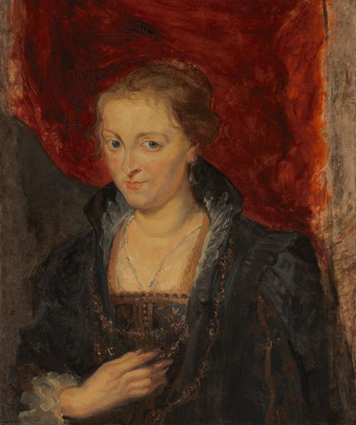 Peter Paul Rubens painted this portrait of his wife, Isabella Brant, with oil on canvas. The painting's visual structure is striking: it combines a dark background with the luminosity of Isabella’s skin and the opulent fabric of her dress. Notice how the artist uses light to define the forms, creating a sense of volume and presence. The composition is carefully arranged, with Isabella’s gaze directed towards the viewer, establishing an immediate connection. Rubens was a master of Baroque art, a movement that sought to evoke emotional responses through dynamic compositions and dramatic use of light. In this portrait, Rubens uses these techniques to portray not just the likeness of his wife, but also a sense of her inner vitality and warmth. The contrast between the dark, enveloping cloak and the bright, exposed skin suggests a tension between concealment and revelation, a key theme in Baroque art. The way Rubens handles paint—the visible brushstrokes and textured surfaces—also adds to the artwork's expressive qualities. It’s in this rich materiality that we find a deeper understanding of Rubens's vision.