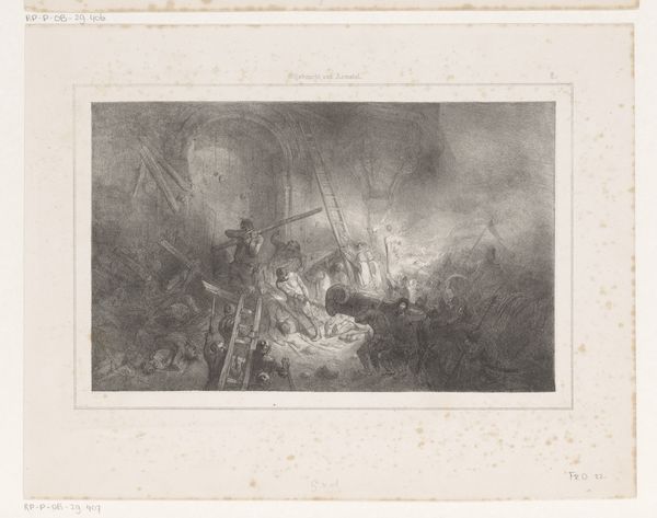 Curator: Welcome. Before us is "Vissers in een roeiboot op zee," or "Fishermen in a Rowing Boat at Sea," an engraving by Léon Jean Baptiste Sabatier, dating from around 1841 to 1850. Editor: Immediately, I'm struck by the drama! The intense contrast between light and shadow—it’s positively operatic. The churning sea practically vibrates. Curator: That’s characteristic of the Romantic movement, with its emphasis on emotion and the power of nature. Consider the compositional structure: the diagonal of the boat slicing through the horizontal waves, creating tension. Editor: And how the size of that little boat, emphasized by the close cropping, underscores the vulnerability of man against the overwhelming forces of nature. It is not a relaxing day at the beach, for sure. It shows the plight of those individuals based upon socio-economic realities. Curator: Indeed. The light falls on the figures themselves and the crest of the immediate wave, drawing our eyes to the focal point. Notice how the engraver employs delicate line work to suggest the texture of the water and the weight of the sky. Editor: How the depiction speaks volumes about the risky business of these fishermen during this era. With just this boat alone, one considers that they may very well struggle. I can practically feel the salty spray! How was such immediacy received at the time? Curator: The narrative underscores broader anxieties regarding industrialization. This reflects a longing for the sublime that moves beyond human control and is associated with Romanticism. It could function as social commentary too. Editor: It's remarkable how this black and white engraving can evoke such a visceral experience. This has offered me new insight into not just the depicted social environment but the visual dynamism present within these classical images. Curator: Absolutely. I find it compelling how Sabatier translated such drama through the exacting art of engraving, focusing on form and emotional weight to portray our social past.