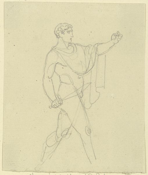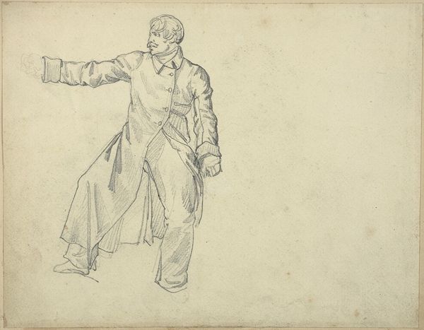 Editor: Here we have Johann Jakob Hoff's "Hessischer Bauernbursche, ganze Figur tanzend," a pencil drawing whose date is, sadly, unknown. I’m struck by the figure’s energy – he seems to be caught mid-celebration. How do you read this work? Curator: This drawing, to me, speaks volumes about the social status and the performative nature of labor. Note the precision in rendering the clothing; the waistcoat, the jacket... how does that level of detail serve to elevate or perhaps even idealize this "Bauernbursche", this young peasant? Editor: That's interesting! I hadn't considered it in terms of idealization. I suppose I just saw a lively snapshot. Curator: Exactly, a snapshot that attempts to preserve an ideal of labor and life in a changing world. Consider the material – pencil. A relatively accessible medium, yet deployed with academic skill. Is Hoff documenting, or is he, through his craft, contributing to the romanticism of rural life, perhaps obscuring the realities of agrarian labor and class differences? What do you think about the clothing details versus the fact it is pencil, not oil? Editor: I guess the detailed rendering almost lends it a sense of dignity. And using a simple medium makes it feel a little more grounded somehow. Maybe Hoff’s intention was less about romanticizing and more about humanizing a worker through careful craft? Curator: Perhaps. Or, maybe both. These drawings offer us insight into the complex relationships between artist, subject, and the evolving societal perceptions of labor and leisure. Considering his hand and skill in this work changes its possible meanings. Editor: I definitely see a new layer to this now - it’s more complex than just a dancing figure. Thanks for helping me see that! Curator: My pleasure!