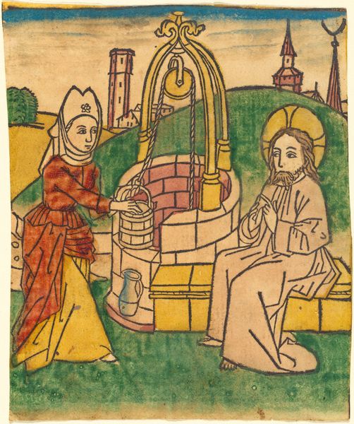 This image of Christ appearing to Mary Magdalene was made by an anonymous artist, using ink and watercolor on parchment. The translucent, subtly modulated washes of color let the texture of the parchment come through, emphasizing its physical presence. The thin lines of the ink drawing define the figures and landscape, but also flatten them, so we are left with the sense of looking at an abstract pattern as well as a scene. This effect may have been heightened by the artist’s use of a compass to define the haloes. The amount of work involved in the production process would have been considerable. First, the parchment had to be prepared from animal skin, then the inks and pigments were mixed by hand according to ancient recipes, and finally the artist would have slowly built up the image, line by line, wash by wash. Paying attention to material and making allows us to see how this image balances a clear symbolic message with a tactile, handcrafted quality. The artwork challenges any firm distinction between fine art and craft.