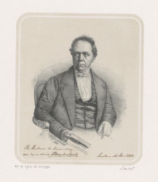 Johan Hendrik Hoffmeister rendered this portrait of Martin Henry Jansen in monochromatic lithography, achieving a study in contrasts and textures. The composition is structured around the subject's upper body, centrally placed and emerging from a subtly shaded background, creating a focal point that captures the viewer’s attention. Hoffmeister employs a precise technique of hatching and stippling to define form and texture, and to articulate the materiality of Jansen's garments and features. This method not only adds depth but also engages with the semiotic language of portraiture, where details like the cut of a coat or the set of the shoulders communicate aspects of status and character. The sharp delineation of the figure against the soft backdrop destabilizes a fixed meaning and challenges the conventional portrait. Hoffmeister's lithograph invites us to consider how meaning is constructed through the manipulation of form and technique. It suggests a space for ongoing interpretation and re-interpretation.