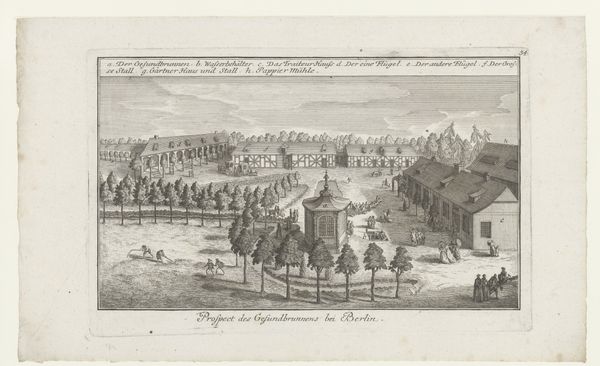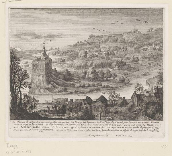 Editor: Here we have "Gezicht op Lille," a cityscape created as an etching by Jan van Huchtenburg in 1685. I'm struck by the sheer detail and perspective of the print, and the almost staged placement of the figures in the foreground. What symbols or cultural meanings jump out at you when you look at this? Curator: What intrigues me are the layers of meaning embedded within seemingly straightforward depictions. It is a representation of Lille. Do you notice the deliberate placement of the church steeple? It acts almost as a visual anchor. Religious structures, in these cityscapes, frequently symbolize not just faith, but also stability, order, and the established power. Consider this against the backdrop of the Dutch Golden Age; what was the social atmosphere? Editor: I suppose the prominence of the church could represent the religious and political influences of the time, despite the burgeoning mercantile culture. Curator: Exactly. The figures on horseback – are they merely a snapshot of daily life or could they be representative of power structures and a sense of authority, almost like a theatrical proscenium? Even the fallen tree could signify disruption or a transition, and possibly speak to an anxiety around the changing social structure of the 17th century. What feelings are stirred in you? Editor: That tension between the established order and potential change. Also, this etching feels so precise, so clearly defined; a demonstration of control during uncertain times. Curator: Control and also perhaps… the *desire* for control. The act of mapping, visualizing, and etching a landscape can be a way to master it, at least symbolically. I'm intrigued how the work allows for insight into both historical narratives and subtle emotive messages. Editor: That makes me think about the power dynamics inherent in how we view and represent places, even today.