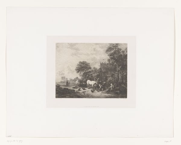Johann Leonhard Raab created this landscape, known as 'Heuvellandschap' or 'Hilly Landscape,' using etching techniques. The composition invites us into a world where nature's forms are meticulously structured. Note the delicate balance between light and shadow, creating a sense of depth and texture. The artist's structured rendering encourages us to consider how nature is perceived and represented. The winding path, the arrangement of trees, and the contrasting tones all seem carefully orchestrated, not simply to mimic reality but to convey a particular idea of it. Raab presents us with a landscape that is both natural and constructed. The etching doesn't just show us a scene; it reveals an underlying structure, inviting us to see beyond the surface and consider the intellectual framework behind it. We may question our notions of perspective and representation in landscape art.