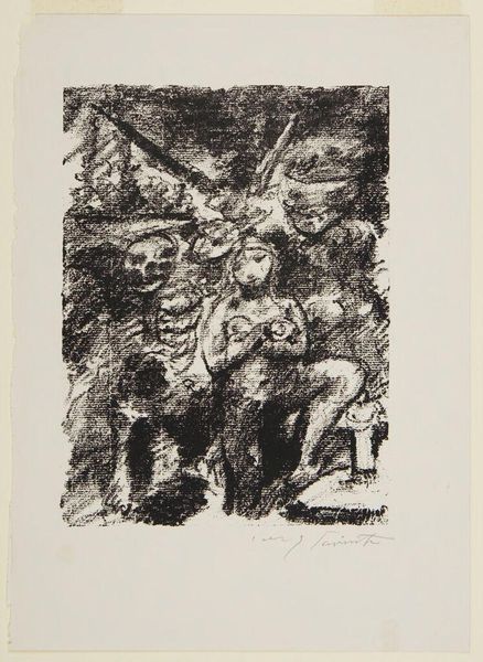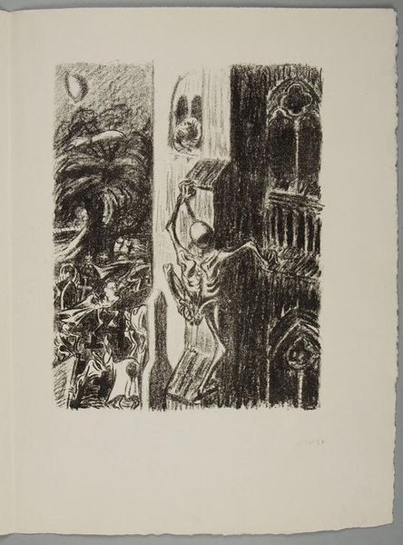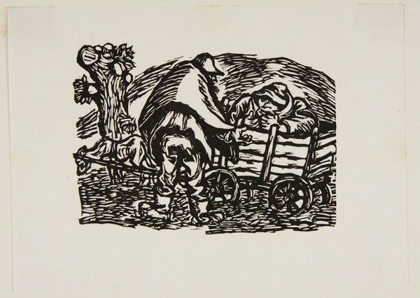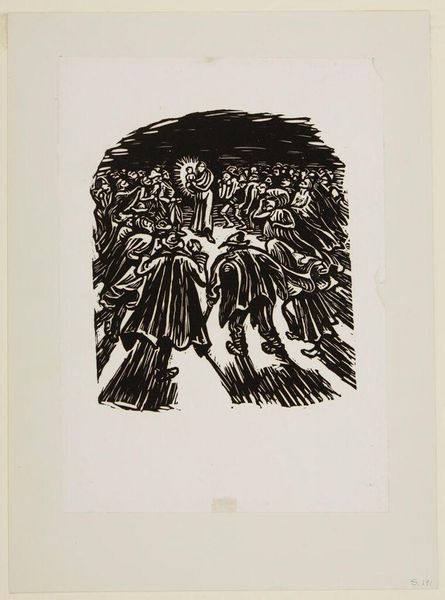 Curator: Ernst Barlach's woodcut, "Fort mit dem Wort vom Menschenfrass," presents us with a stark scene. Editor: Wow, just from looking at it, I feel a sense of desperation mixed with a strange kind of defiant joy, like a storm brewing inside and out. Curator: The high contrast and angular lines of the woodcut technique certainly amplify the emotional intensity. Notice how the composition draws the eye upward, emphasizing the central figure's raised arms. Editor: Yeah, and the way the rain or light, or whatever it is, seems to radiate outward, almost like the figure is conducting the chaos around them. Is it hope or madness? Maybe it's both. Curator: Indeed, the ambiguity is key. Barlach's work often grapples with the complexities of human experience, leaving room for multiple interpretations. Editor: Well, I know that I'm now thinking about power, vulnerability, and how we respond when everything falls apart, so that's pretty successful art, right? Curator: A fitting end to our short visit today, considering this piece's visual and thematic complexity. Editor: It's definitely a powerful image that lingers long after you've moved on.