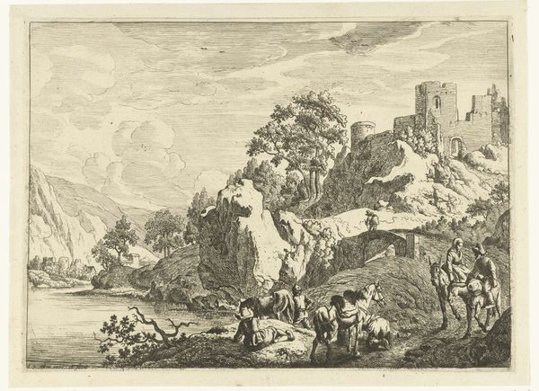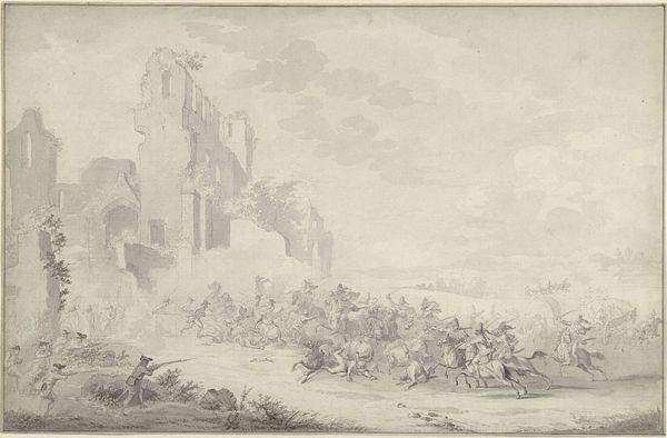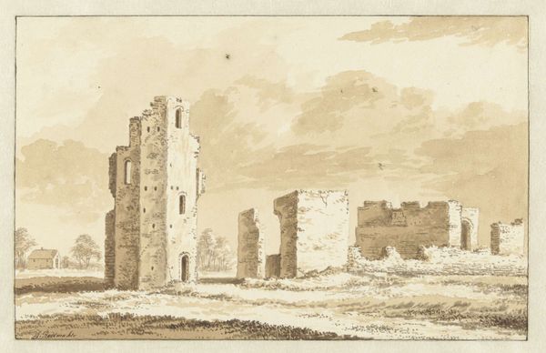 Jan de Beijer rendered these remains of Kranendonk Castle with pen and brush around the 1700s, capturing not just stone, but the very essence of time's relentless passage. The ruined castle, a dominant motif, speaks volumes. Once a symbol of power and authority, it now crumbles, mirroring the ephemerality of human endeavors. This visual language of ruins is not new; we see it echoed in ancient Roman depictions of fallen empires, a memento mori urging reflection on mortality. Note the goats grazing among the wreckage. These creatures, symbols of vitality and life, juxtaposed against the decay, create a tension. They recall similar contrasts in Renaissance art, where pastoral scenes often played against the backdrop of classical ruins. The crumbling stone and the enduring life force create a powerful emotional resonance. This image reminds us that while structures may fall, the pulse of life continues, forever reshaping our understanding of history and memory.