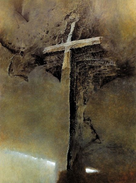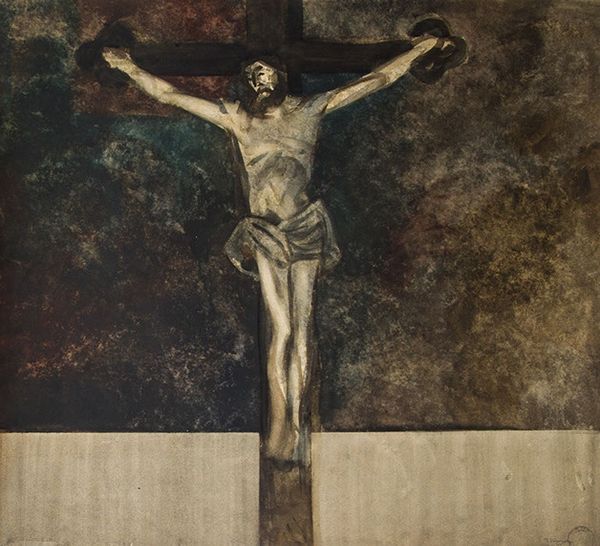 Editor: This compelling piece is Tadeusz Makowski’s “Christ on the Cross” from 1906, rendered with oil paint. I'm immediately struck by the darkness, but also how the light seems to fight against it, particularly highlighting the wooden structure. What do you see in this piece in terms of its materials and context? Curator: What I see here is a work grappling with the social reality of faith as labor, especially around the turn of the century. The oil paint itself, so thickly applied, becomes a kind of crude, almost industrial material. Consider the socio-economic context: were religious icons mass-produced? Were these expressions seen as challenging tradition? Editor: That's interesting – I hadn't considered the process of creating the image as connected to labor. Is it almost a critique of religious institutions by implying they are industrial? Curator: Perhaps. Or, perhaps more subtly, it invites us to contemplate the material conditions that enable spiritual contemplation. Think about the labour involved in extracting pigments, preparing canvases, or even in the act of painting itself. Who had access to these materials, and under what conditions were they used? The use of darker tones and visible brushstrokes seems to resist idealized portrayals. Editor: So it's almost forcing us to acknowledge the physical process behind something we might normally view as purely spiritual. Curator: Exactly. How does this challenge, or perhaps reinforce, the divide between art and craft? Editor: I’m now thinking about how the roughness and somber colours affect the depiction itself - how different is it from works that employed smoother paint? Curator: It shifts the meaning. We're moving away from an untouchable icon and towards a depiction made from and consumed by the real world. Editor: I'll never look at religious art the same way again! Curator: Wonderful! Considering art as a product of social, material, and labor systems changes our interpretation drastically.