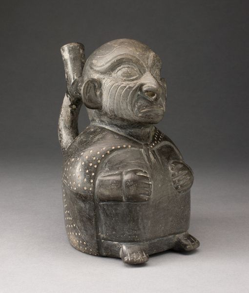 Curator: This is a portrait vessel of a seated official, created by the Moche culture around the year 400. It's made of ceramic and is currently held at The Art Institute of Chicago. What are your first impressions? Editor: Stark and commanding. Despite its rounded form, the figure radiates authority and self-possession. The ceramic material, with its earthy tones, lends a gravity to the piece. Curator: It’s intriguing to consider the labor involved in crafting these ceramics. Each vessel required skillful hands to mold the clay, build the form, and then fire it to perfection. There would have been very specialized workshops for this. Editor: And beyond the immediate labor, the creation of this image of power would have had sociopolitical ramifications. Who got to be immortalized this way? What does that say about social structures within Moche society? We can ask ourselves to what degree such traditions resonate in our own context. Curator: Absolutely. The uniformity of production points to a standardized aesthetic likely enforced or influenced by ruling elites. Considering the controlled access to clay resources, we begin to understand the embedded power dynamics within material constraints. Editor: Right. We must examine portraiture like this through an intersectional lens. What did gender, race, and social standing mean for the official represented? These considerations would inform our reading of his stern gaze and upright posture. It invites questions about gender roles in power within the Moche culture. Curator: Such considerations about material limitations versus skilled labor allow us insight into the division of craft in Moche society, too. There would have been strict social barriers at play in the access of resources and the subsequent means of production. Editor: It is impossible, finally, to truly know another’s interiority. Nevertheless, it provides us space to wonder what it might have meant to live in that era. These material remains can then function as launching pads for more complex and engaged investigations. Curator: This has made me want to dive more deeply into the geological realities present within the region, and how these dictated trade and the potential for further resource accumulation. Editor: Indeed. Hopefully listeners can appreciate the sculpture anew with questions like these.
