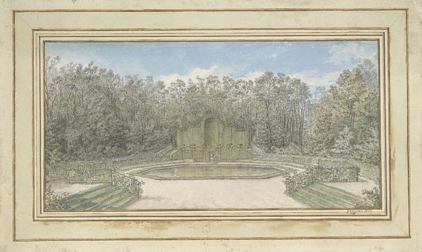 Curator: This delicate watercolor and etching by Thomas Sandby gives us a "View of the Flower Garden and Aviary at Kew," dating back to 1763. Editor: It possesses an almost dreamlike quality, doesn't it? The washes of color are so gentle. The building appears to float amid the precise geometry of the garden layout. The tonal paper definitely enhances that feeling. Curator: Indeed. Kew Gardens itself held significant symbolic value in Georgian England, embodying enlightenment ideals and the burgeoning field of botany. The exotic plants housed within spoke to the Empire's global reach. This aviary represents both scientific curiosity and aesthetic pleasure. Editor: The strict horizontal and vertical lines juxtapose the natural world, almost as if man can order even nature to his whim. The octagonal structure with the dome lends itself perfectly to a kind of natural panopticon. The interplay between shadow and light provides depth to the plane. Note how Sandby's skillful lines evoke architectural precision without sacrificing artistic sensitivity. Curator: Absolutely. And let's not forget the symbolic import of the aviary. Birds have long represented freedom, aspiration, and even the soul. To contain them in such an elaborate structure raises questions about control versus appreciation. It echoes similar symbolic avian imageries through time. Editor: And yet, the delicate colors soften that potential sense of enclosure. I find a peculiar kind of balance here between restraint and beauty. Even with the grid-like design and architectural rigidity, there is movement within the image due to the distribution of dark and light. It makes the building almost appear translucent! Curator: Yes, the interplay between nature, architecture, and scientific inquiry resonates deeply when viewing Sandby's artwork. It invites a richer interpretation, given its complex layers. Editor: Precisely. It is like encountering two seemingly disparate worlds in equilibrium.