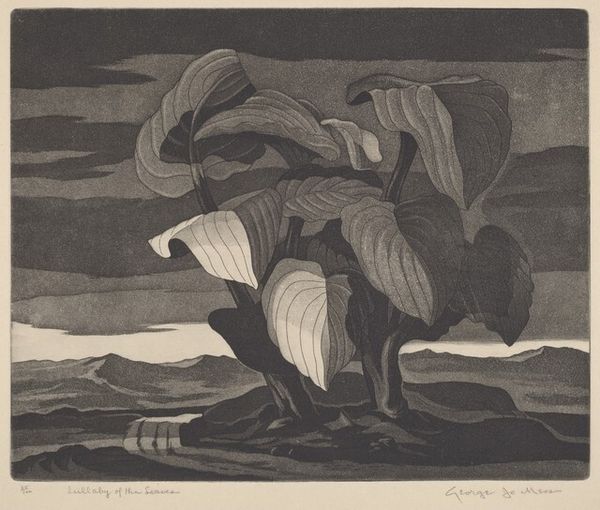 Curator: Anna Heyward Taylor's woodcut, "Sea Turtle," circa 1929, presents a compelling study in contrasts. The interplay of black and white immediately draws the eye. What are your initial thoughts? Editor: Oh, I love the simplicity! It's like a dream, the turtle swimming in a sea that’s both calm and wild. Those palm trees—they're so stylized, like little explosions of joy against the dark sky. It's got a real primal vibe. Curator: Precisely! Note how Taylor uses line to create depth and texture. The palm fronds, for example, are rendered with remarkable economy, yet they convey a sense of lushness and movement. Then you have the swirling waves, a more dynamic counterpoint. Semiotically, the turtle could symbolize longevity, steadfastness against the ocean’s shifting tides. Editor: True, but the turtle also feels kind of vulnerable, right? It's surrounded by all this—these bold, graphic elements, the churning waves…It’s small, in comparison, adrift. Maybe a commentary on the precariousness of life, even for creatures that have been around forever. Curator: That resonates, particularly given the era in which this piece was created. The interwar period, with its undercurrent of uncertainty, might well have informed Taylor’s artistic choices. Her formal rigor, however, maintains a sense of equilibrium, preventing the image from succumbing to pure sentiment. Editor: But, it’s so emotive for being black and white and only a woodcut print! Look how the curves of the waves echo the shape of the turtle’s shell; it’s almost like they’re dancing together. There's an elegance to it, a flow, that suggests harmony despite the potential dangers lurking beneath the surface. Curator: An astute observation. The artist juxtaposes vulnerability with resilience. Thank you for your emotional and enlightening insight on it. Editor: The pleasure was all mine! It’s pieces like this that remind me why art matters—it can whisper profound truths in the most unexpected ways.