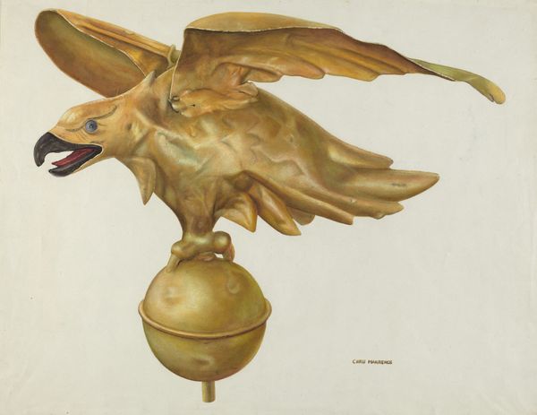 Curator: Welcome. We’re looking at "Pilot House Figure (Eagle)," a watercolor made around 1937 by Walter Hochstrasser. Editor: The colors strike me first. The brown and gray tones of the eagle, contrasted with the red and white base – it feels very grounded, even stern. And the eagle's open beak—it’s almost shouting. Curator: It’s a depiction of a decorative figure, most likely carved in wood, designed for the pilot house of a ship. These eagles, and other figures, were symbols of prestige and national pride, heavily influenced by government projects from that time. The representation echoes official monumental sculpture but shrunk down. Editor: Given that period, it feels heavy with that familiar American symbolism. That symbol itself, of course, has a complicated legacy. Power and freedom for some were intertwined with dispossession and oppression for others. Is it intended to provoke a sense of authority, dominance, control? I can’t help but consider this legacy looking at the outstretched wings and fierce expression. Curator: That’s a valid observation, given the era. The figurehead’s display of nationalistic symbolism served multiple functions, asserting not just the ship owner’s status but also America’s place in global commerce. Editor: It's also worth thinking about how Hochstrasser chose to represent it. He selected watercolor, a medium not typically associated with grandeur, which creates an interesting tension. Curator: And yet he still manages to capture the weight and detail. This artwork brings to the fore ideas about commerce, patriotism, and how they materialize in art. Editor: Indeed. Viewing it today allows us to critically engage with that complicated, still-relevant relationship. Curator: Hopefully, visitors will contemplate its impact through the combined lenses of history, symbolism, and critical awareness. Editor: Agreed. It encourages looking deeper into that history.