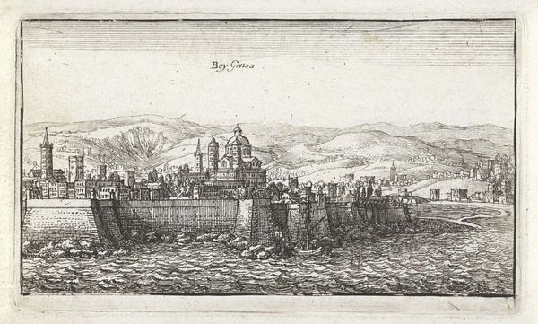 Wenceslaus Hollar created this etching of 'Gezicht op Dover Castle' to show a panoramic view of Dover Castle from the west side. Hollar, born in Prague, lived through a tumultuous period marked by the Thirty Years' War, which deeply affected his life and travels across Europe. The detailed etching provides a documentary record of the castle's architecture and its strategic importance as a defensive structure. It's a moment captured during shifting political and military landscapes. Hollar's personal experiences as a refugee from war-torn regions might have influenced his choice to depict fortified landmarks, symbolizing safety and permanence amidst chaos. Notice the ships in the distance, suggesting the castle's role in maritime activities. Hollar's skill captures not only the physical structure but also the sense of place and history. It reminds us that even seemingly static landmarks are deeply embedded in complex social and political narratives.